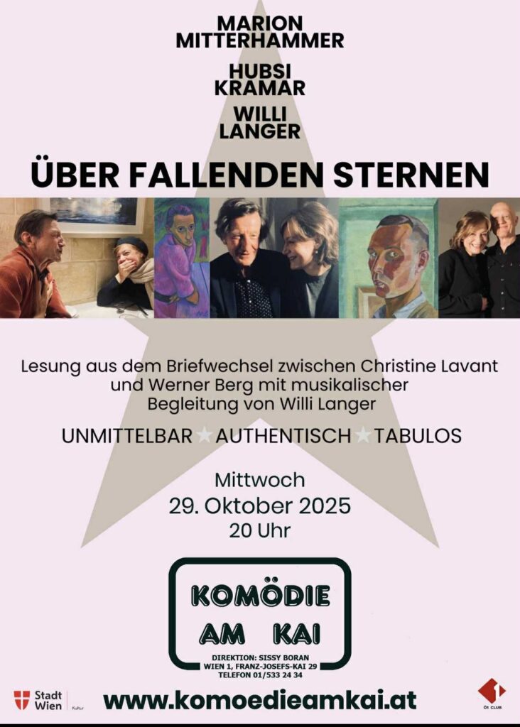 Wir möchten Sie gerne auf eine Lesung am 29. Oktober 2025 in der Komödie am Kai in Wien aufmerksam machen. Die aus vielen Fernsehproduktionen bekannten Hubsi Kramar und Marion Mitterhammer lesen, musikalisch begleitet von Willi Langer, aus dem Briefwechsel Christine Lavants mit dem Maler Werner Berg.
