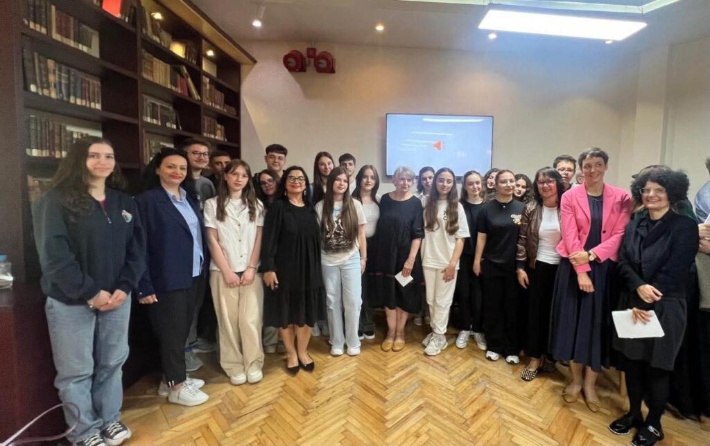 Anna Kove mit Botschafterin Monika Zach, Eljana Mankollari und SchülerInnen einer Deutschklasse in der Nationalbibliothek in Tirana – © Tommy Schneider